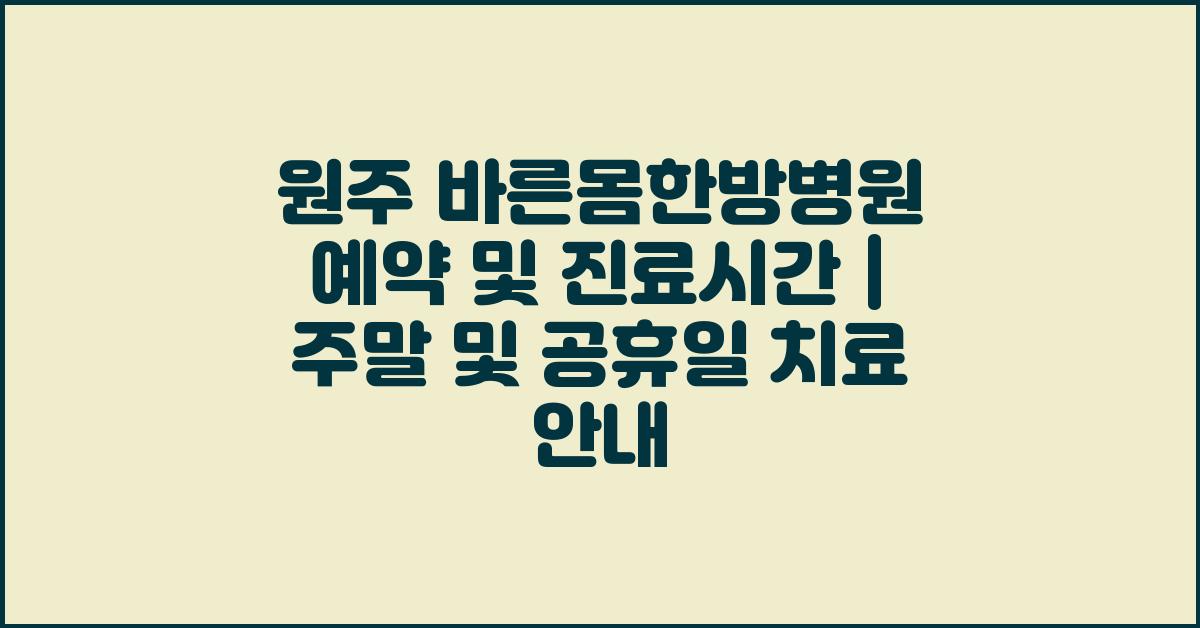 원주 바른몸한방병원의 예약 및 진료시간은 매우 유연하게 운영됩니다. 월요일부터 금요일까지는 오전 9시부터 오후 6시까지 진료를 진행하며, 주말에는 오후 2시부터 5시까지 운영됩니다. 공휴일에도 일부 진료가 가능하니, 항상 사전 예약을 통해 확인해 주시는 것이 좋습니다. 제가 처음 예약했을 때, 원하는 시간에 치료를 받을 수 있어 매우 만족스러웠던 기억이 납니다.
